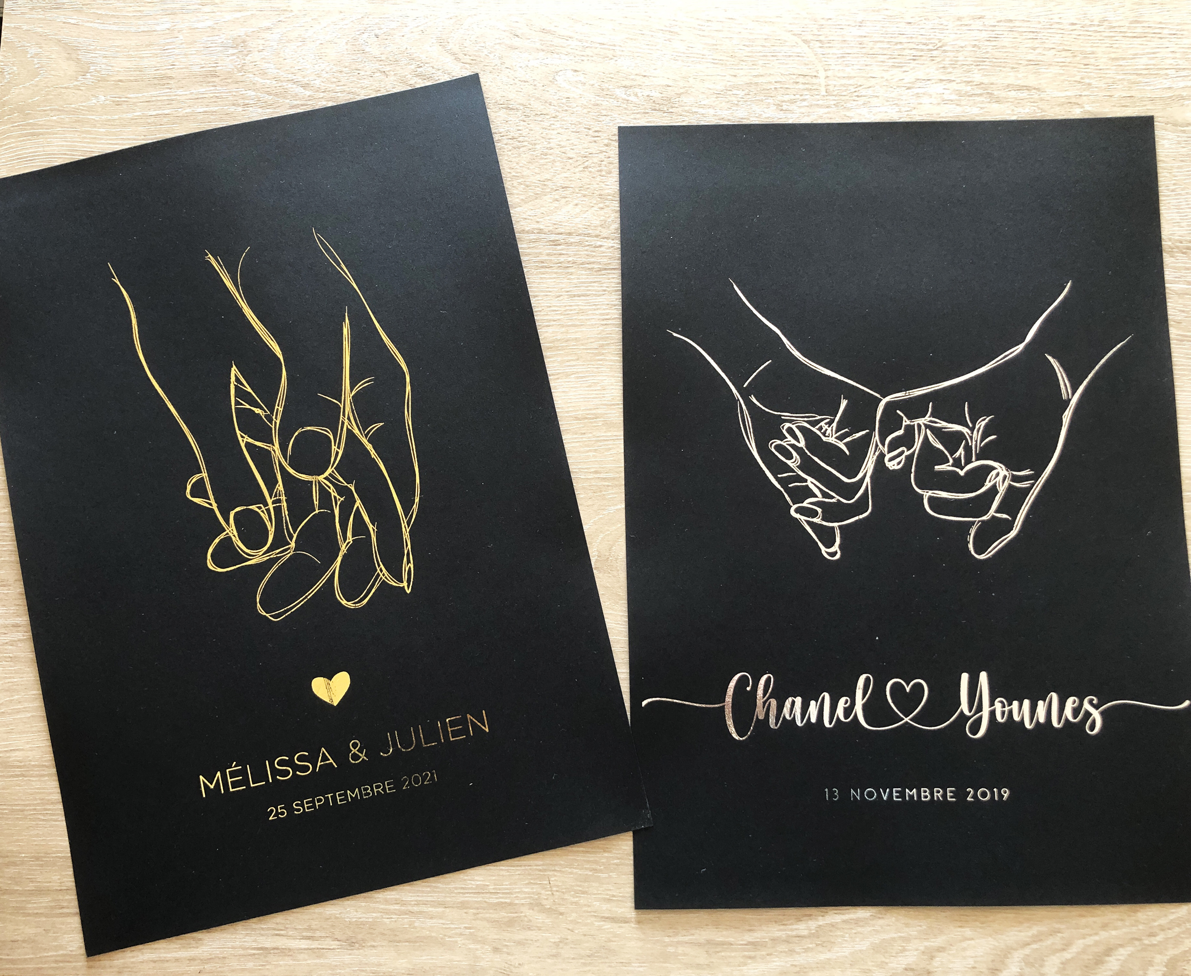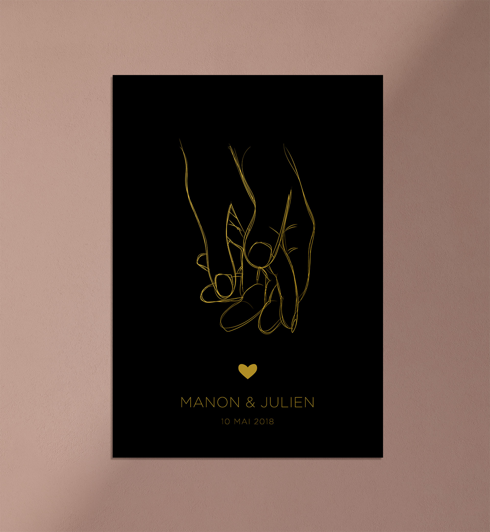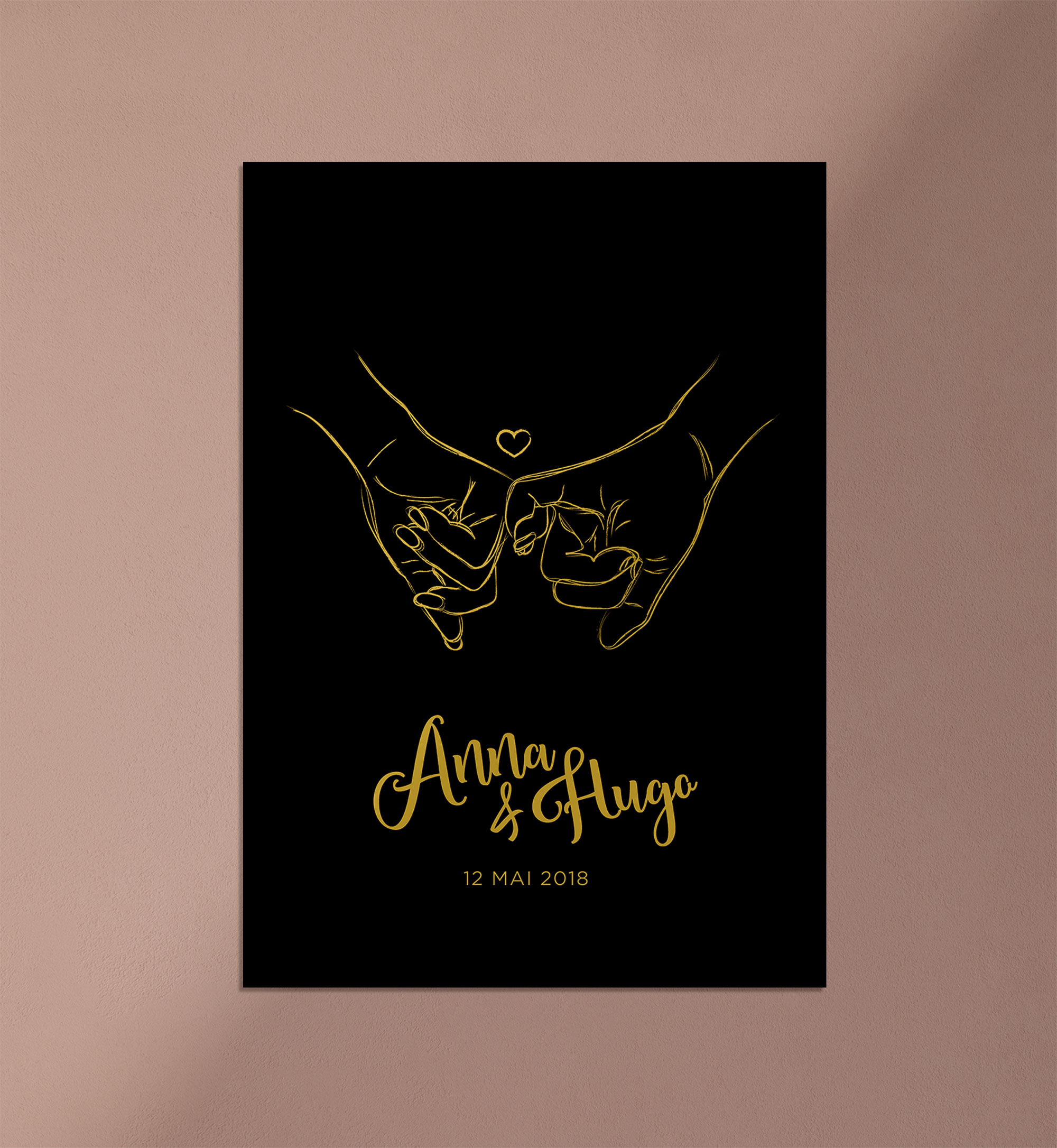 Vos deux mains qui se tiennent et qui scellent votre amour. Avec vos prénoms et une date clé.