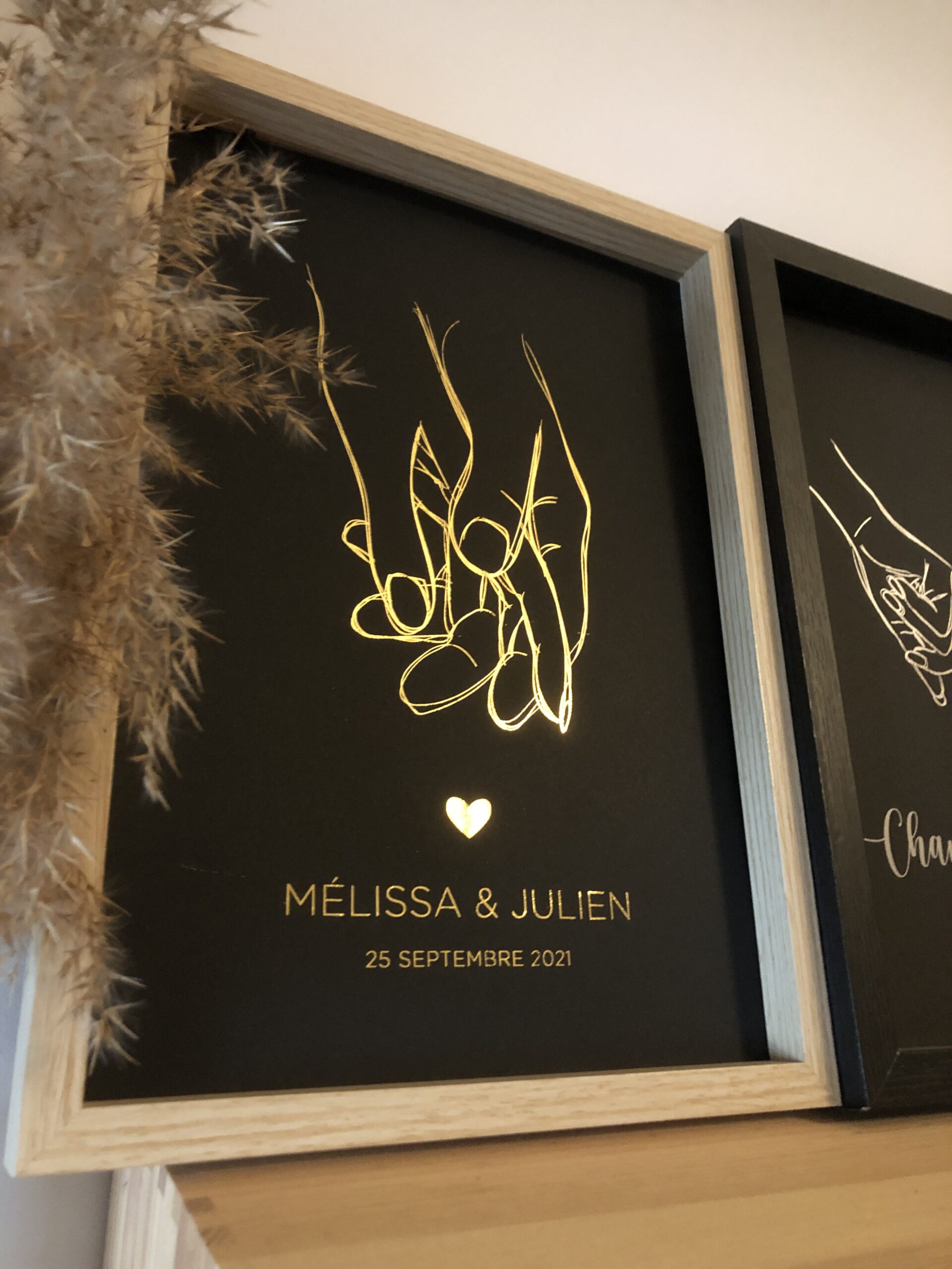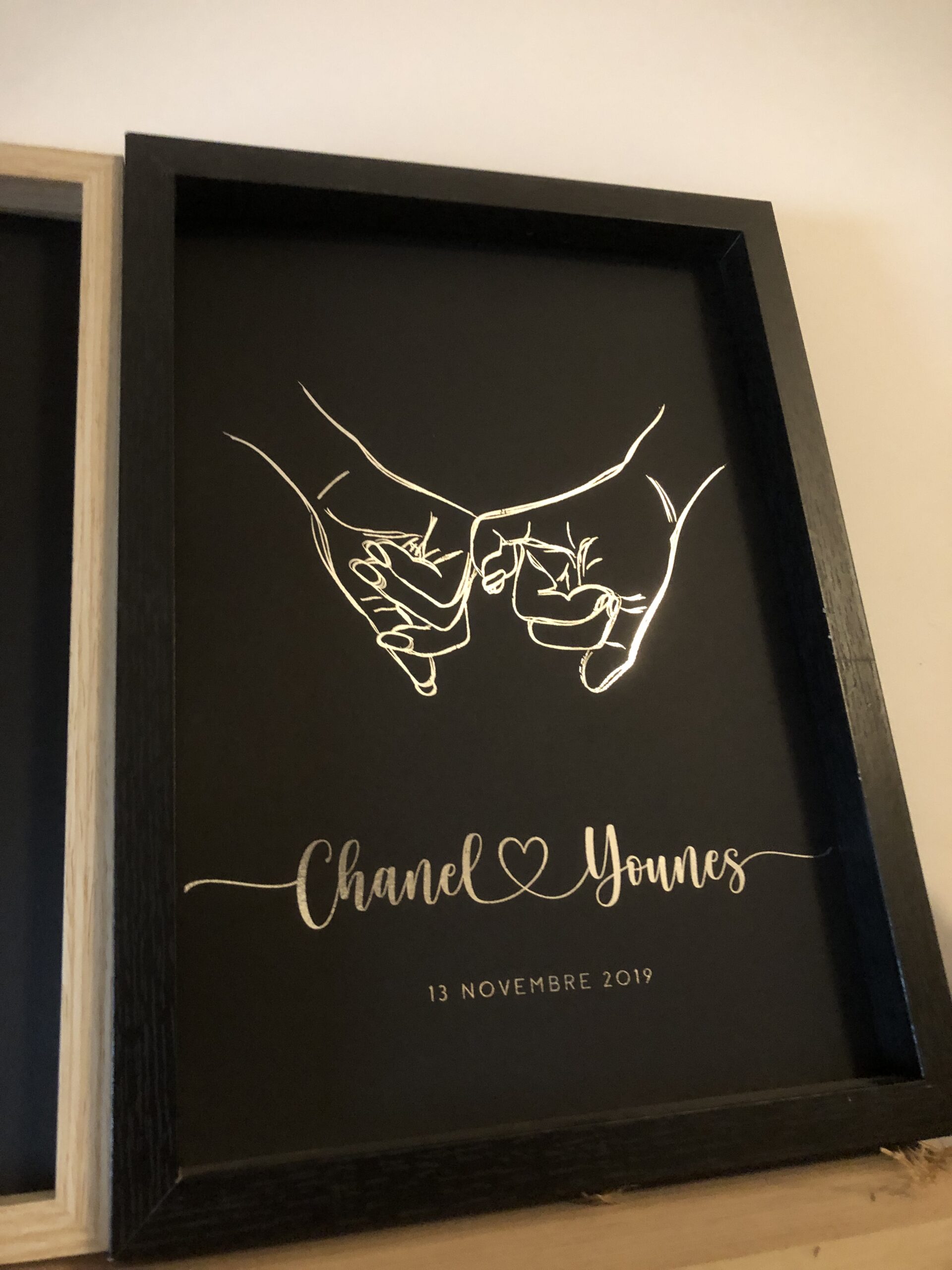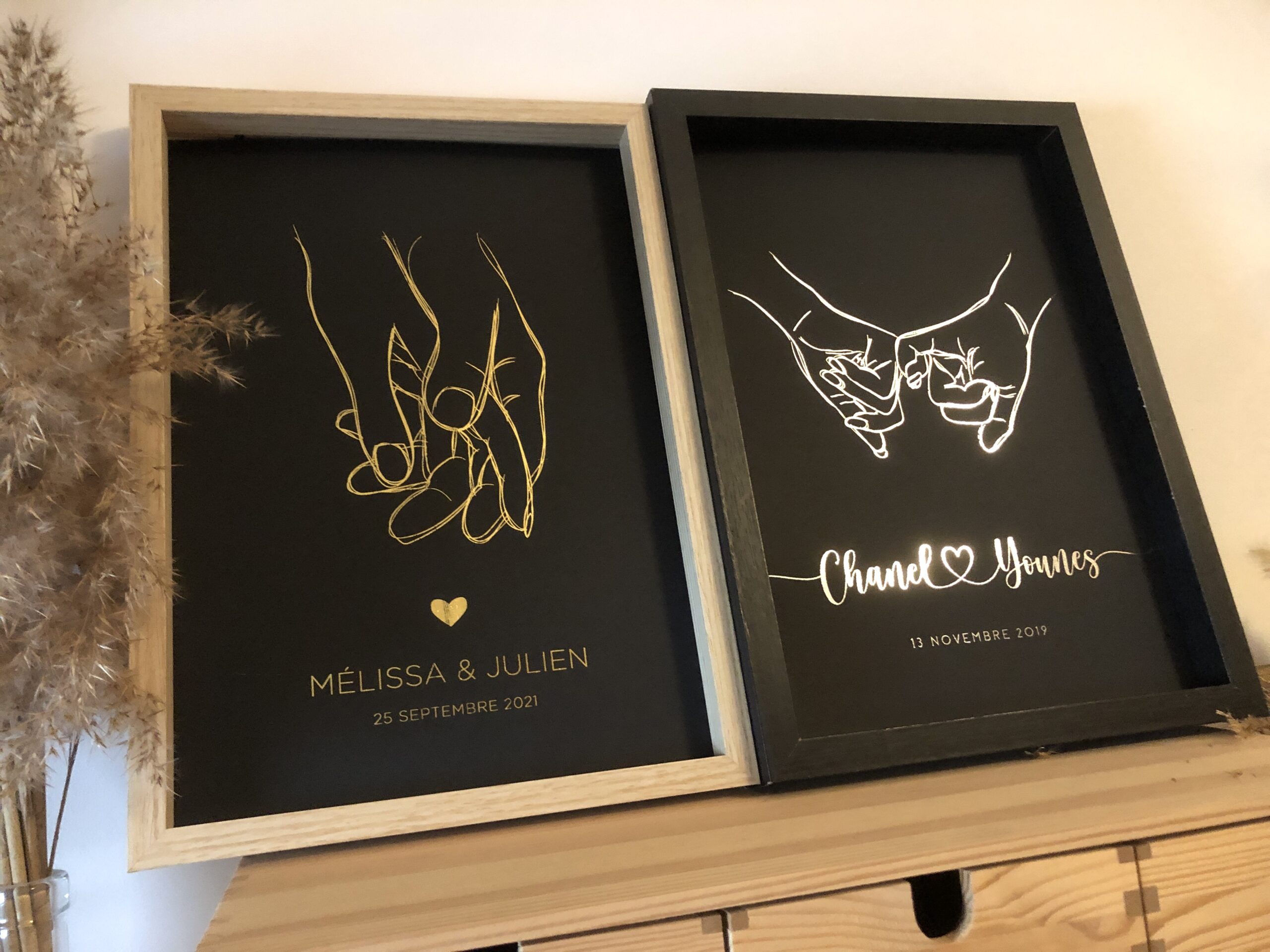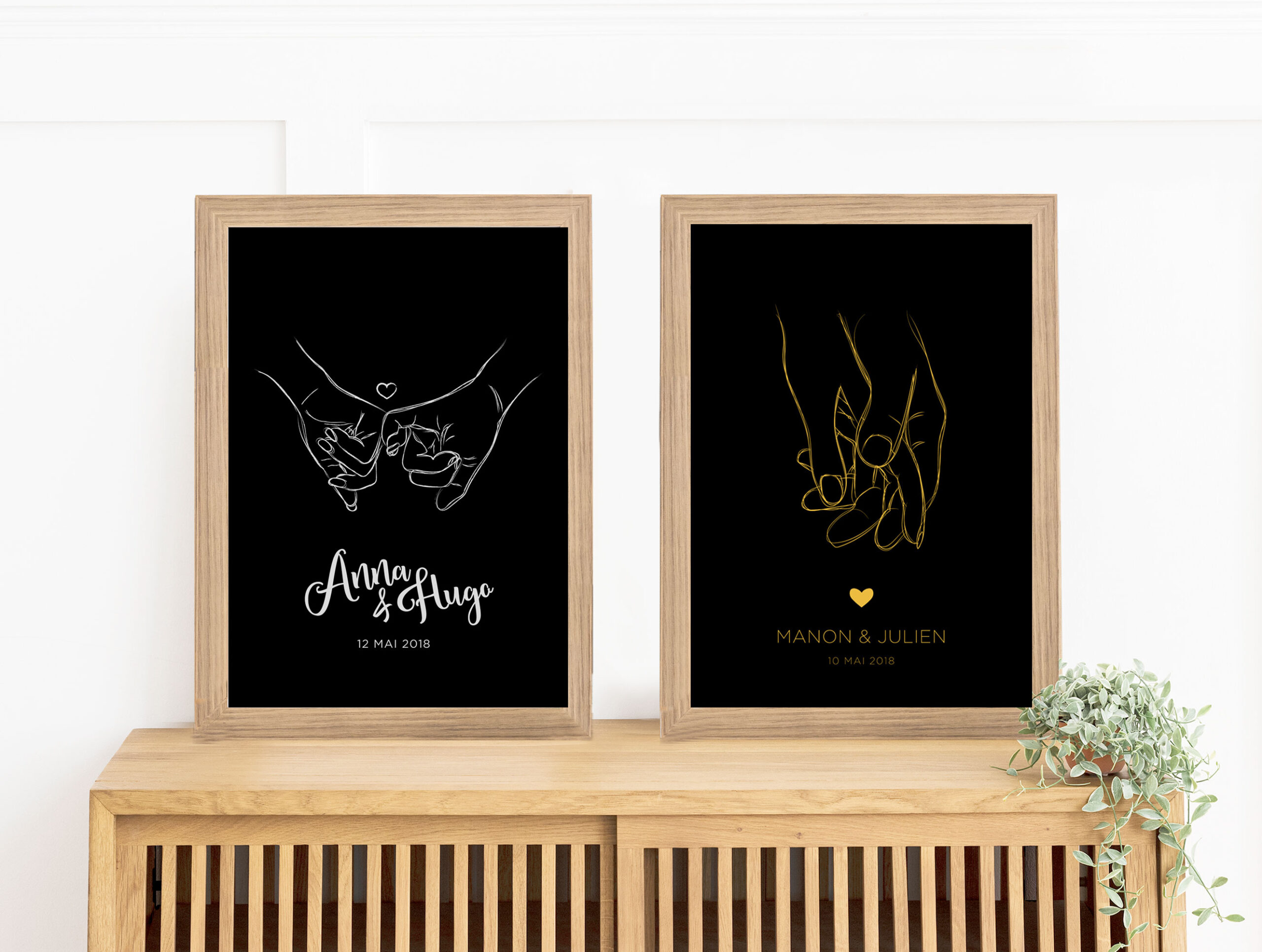 Vos deux mains qui se tiennent et qui scellent votre amour. Avec vos prénoms et une date clé.