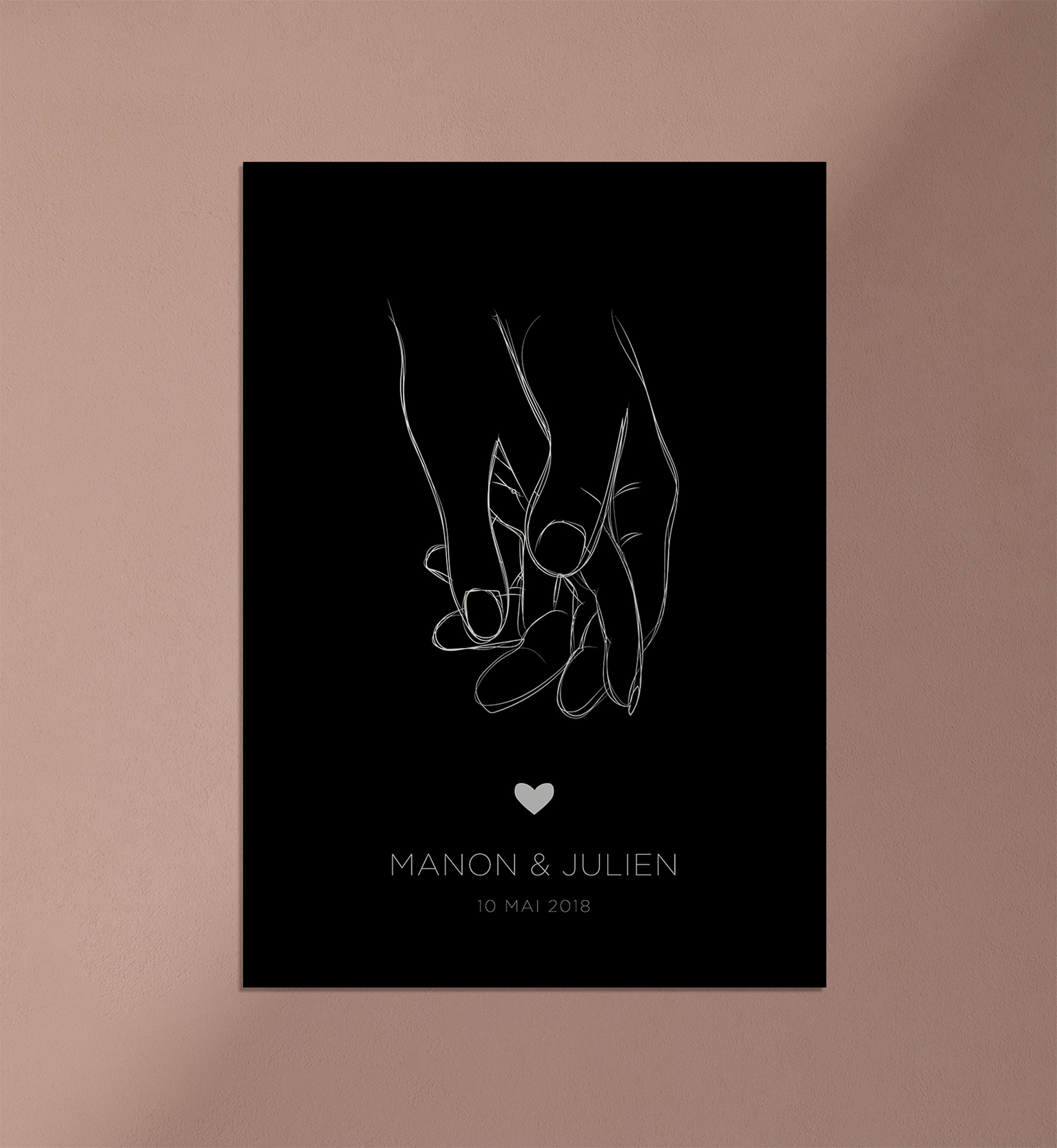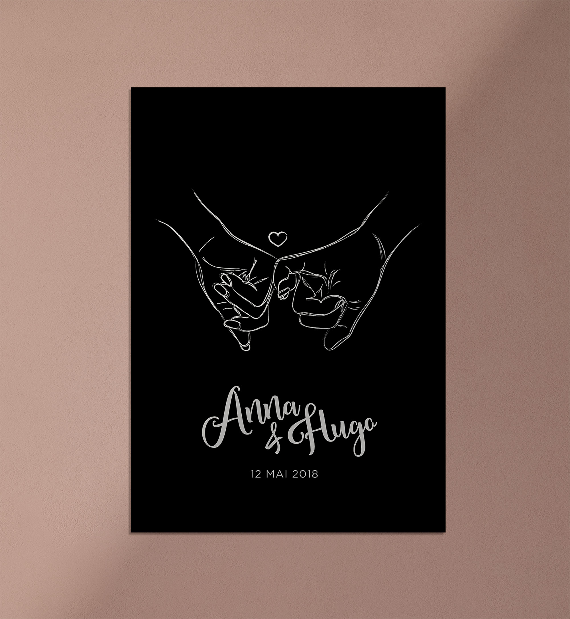 Commandez dès maintenant votre affiche amour mains entrelacées dans un style minimaliste et moderne et laissez-vous envoûter par la magie de l’amour éternel.