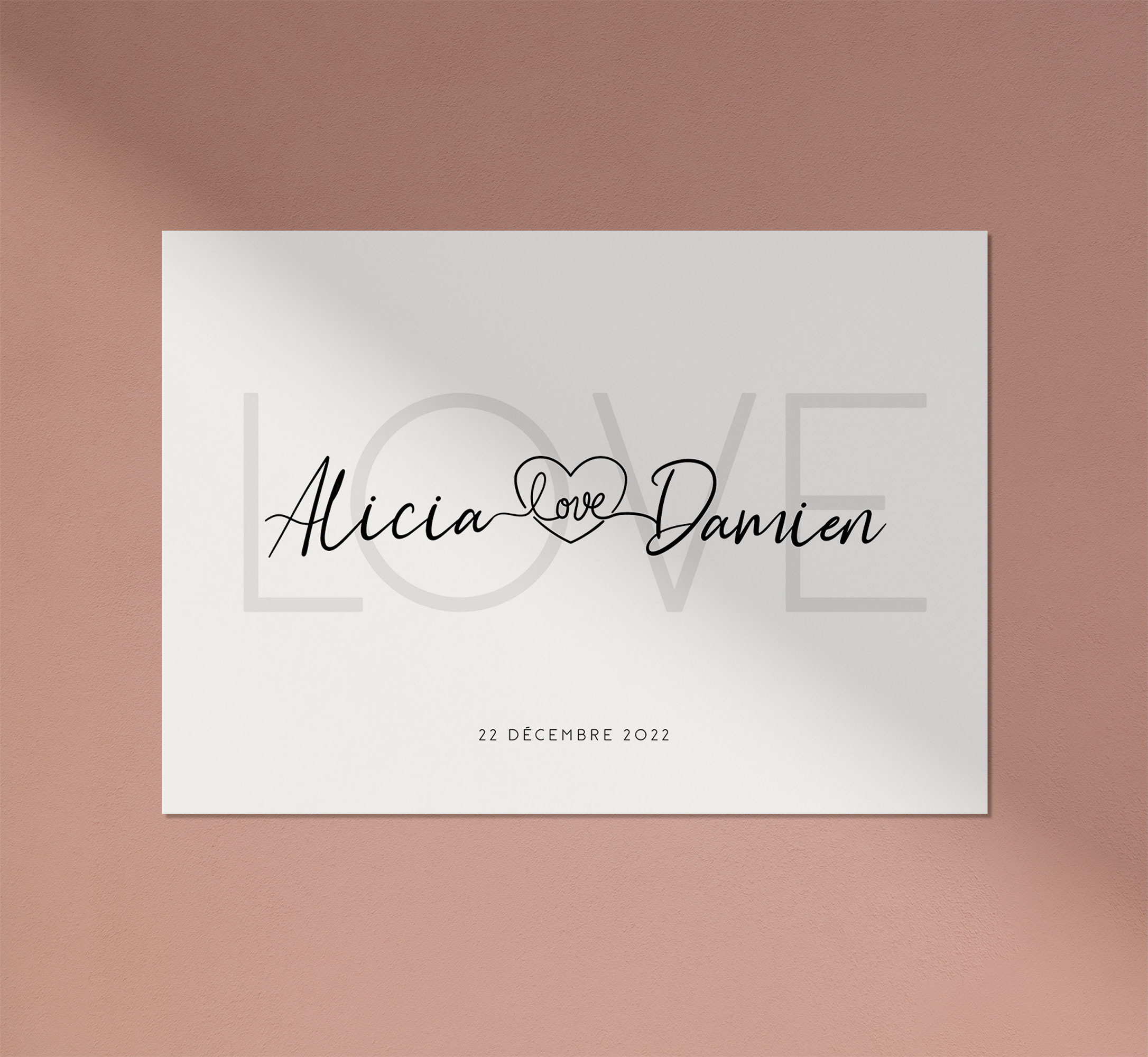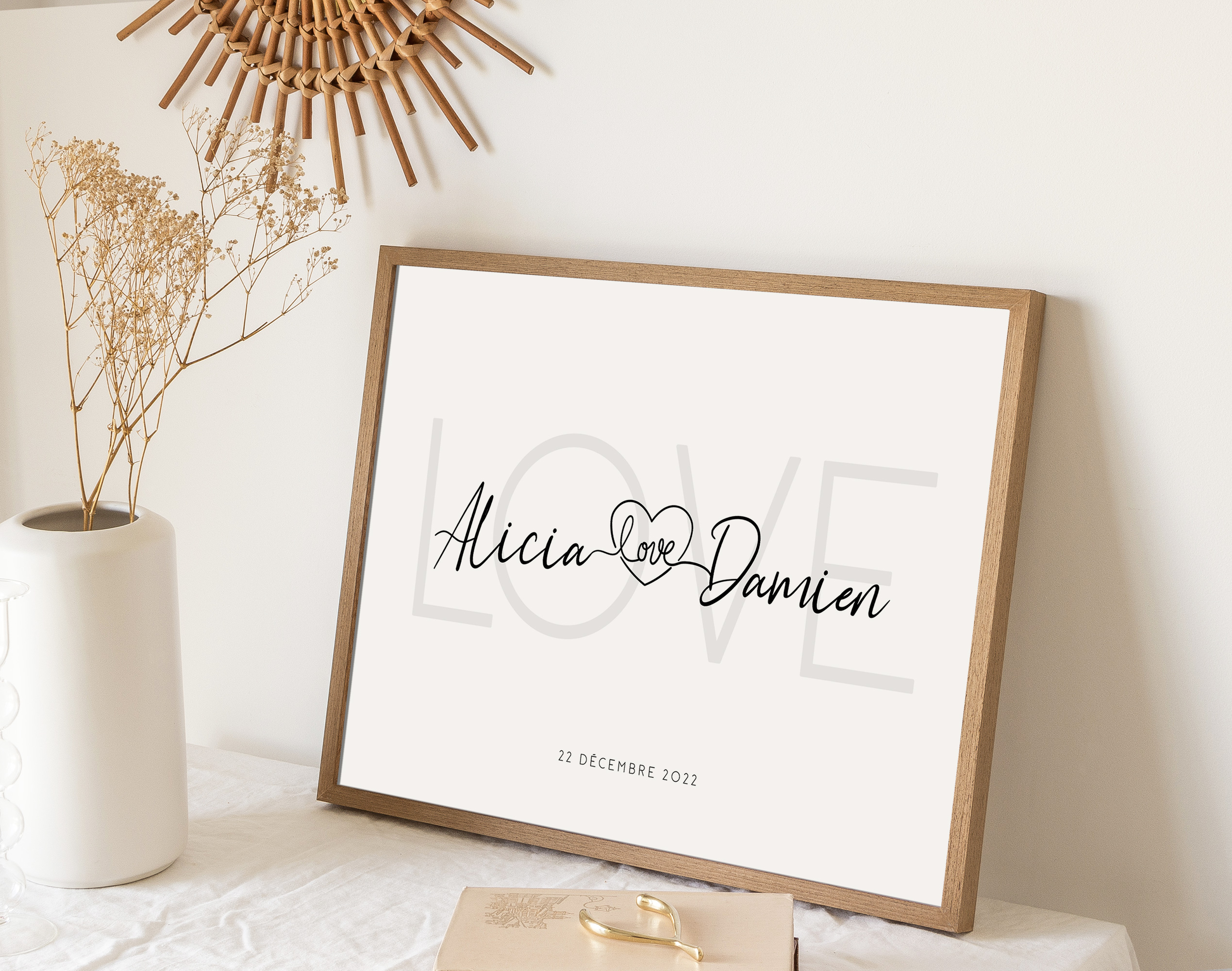 Sur cette affiche, vos prénoms sont entrelacés dans une police délicate et élégante, symbolisant l’union profonde et l’amour passionné que vous partagez. Les lettres sont conçues avec soin pour former un design harmonieux et lien avec le coeur, ajoutant une touche de romantisme à n’importe quelle pièce.