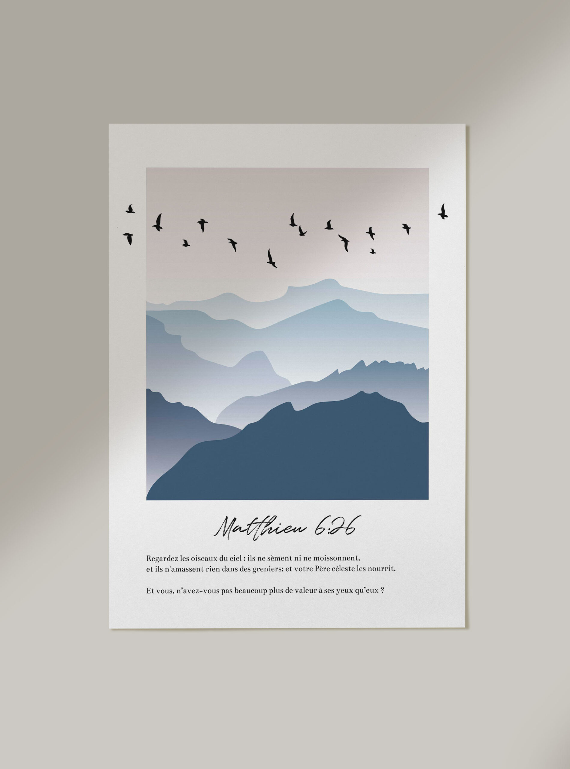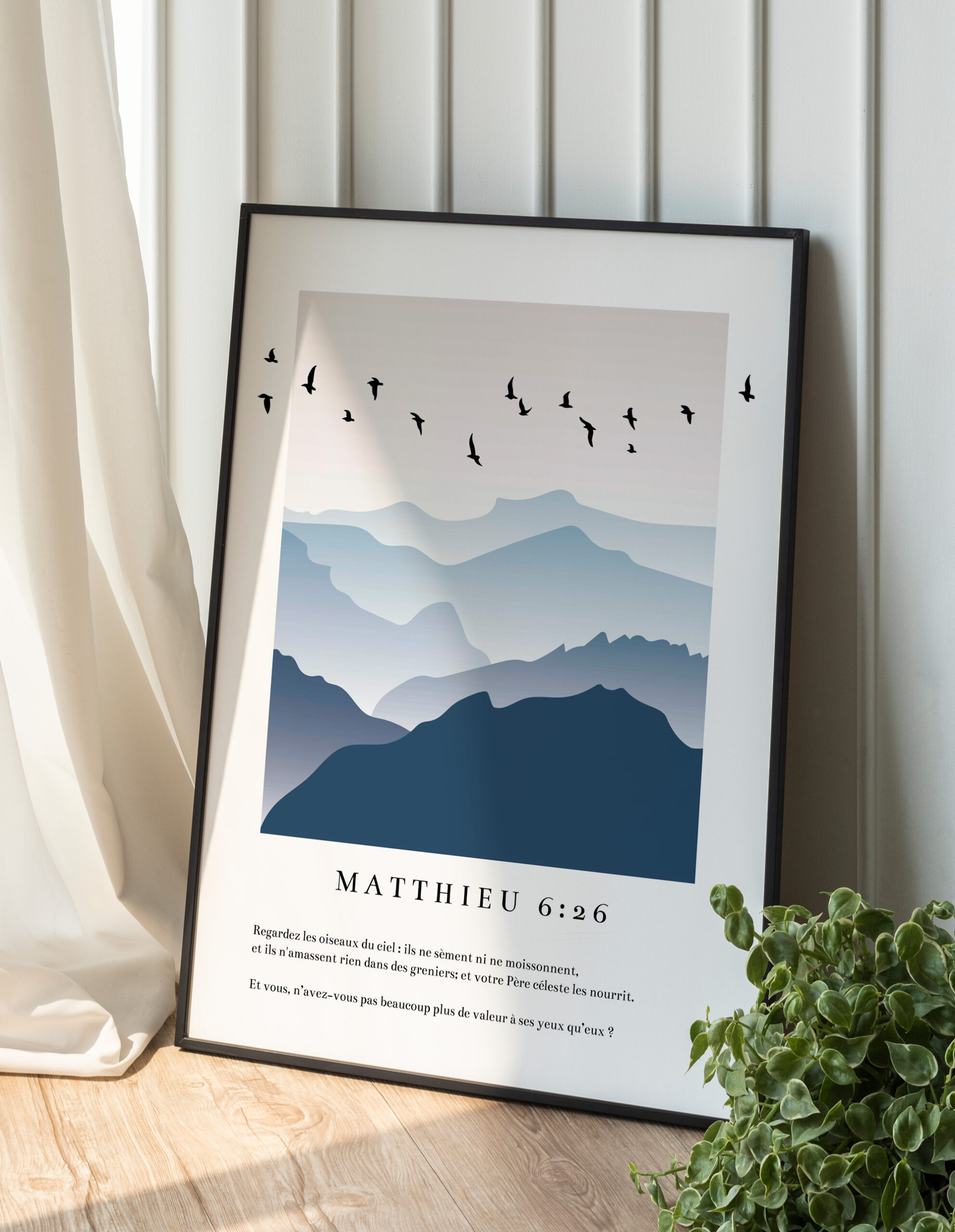 Apportez paix et inspiration à votre intérieur avec cette magnifique affiche chrétienne illustrée du verset Matthieu 6:26.